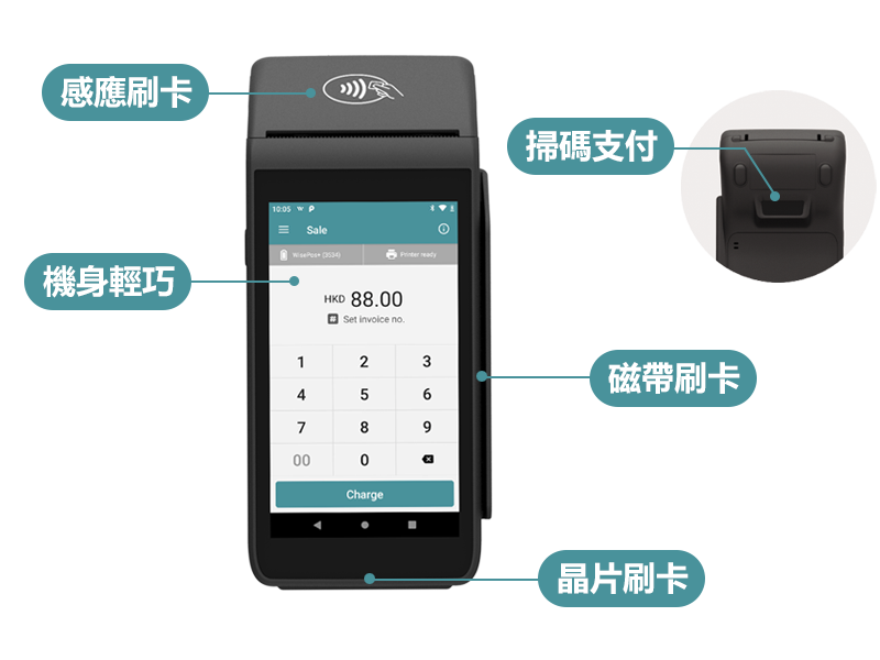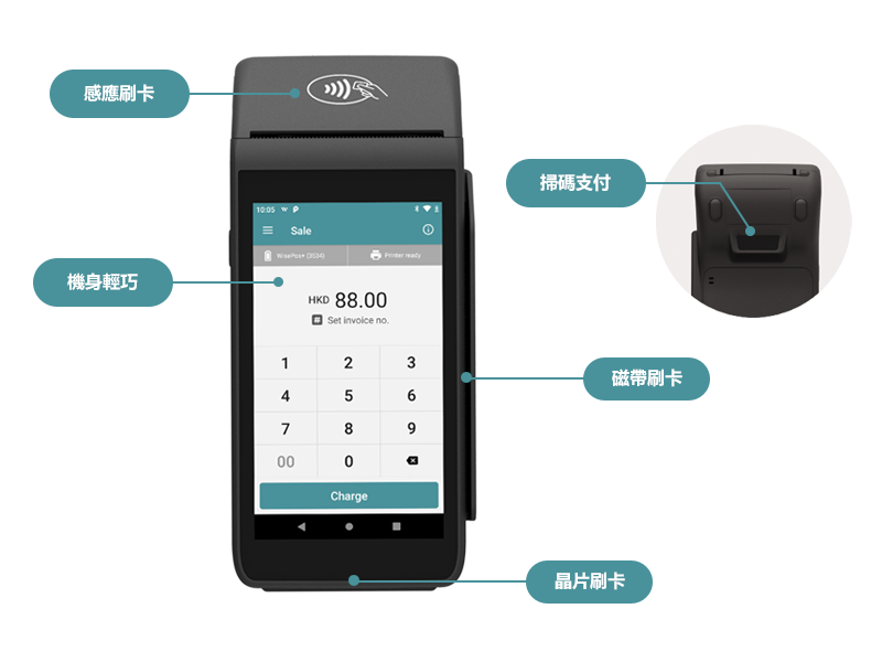 一部POS機收款裝置不再受地點限制,只需WIFI或數據卡連接,支援17種主流電子支付方式,滿足消費者不同支付習慣,提高銷售額,增強收款靈活性。